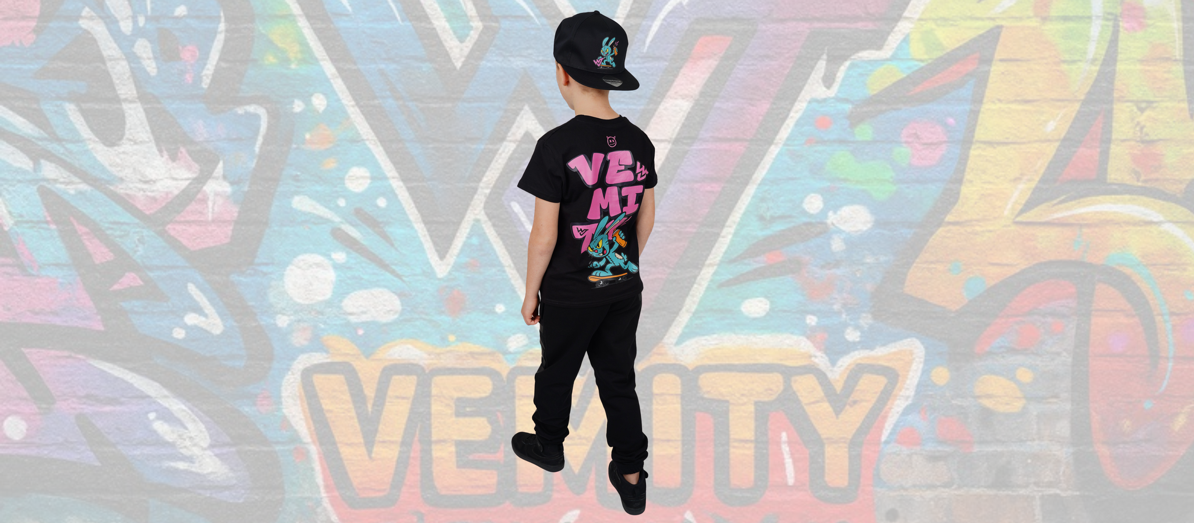 Hlavní hvězdou je velkoformátový graffiti design s cool cartoon postavičkou na skateboardu. Energické neonově růžové a tyrkysové barvy v kombinaci s nápisem VEMITY vytváří autentický streetový vibe, který připomíná nejlepší éru 90's skate kultury. Každý detail je propracovaný – od dynamické pózy postavičky až po graffiti styl písma.